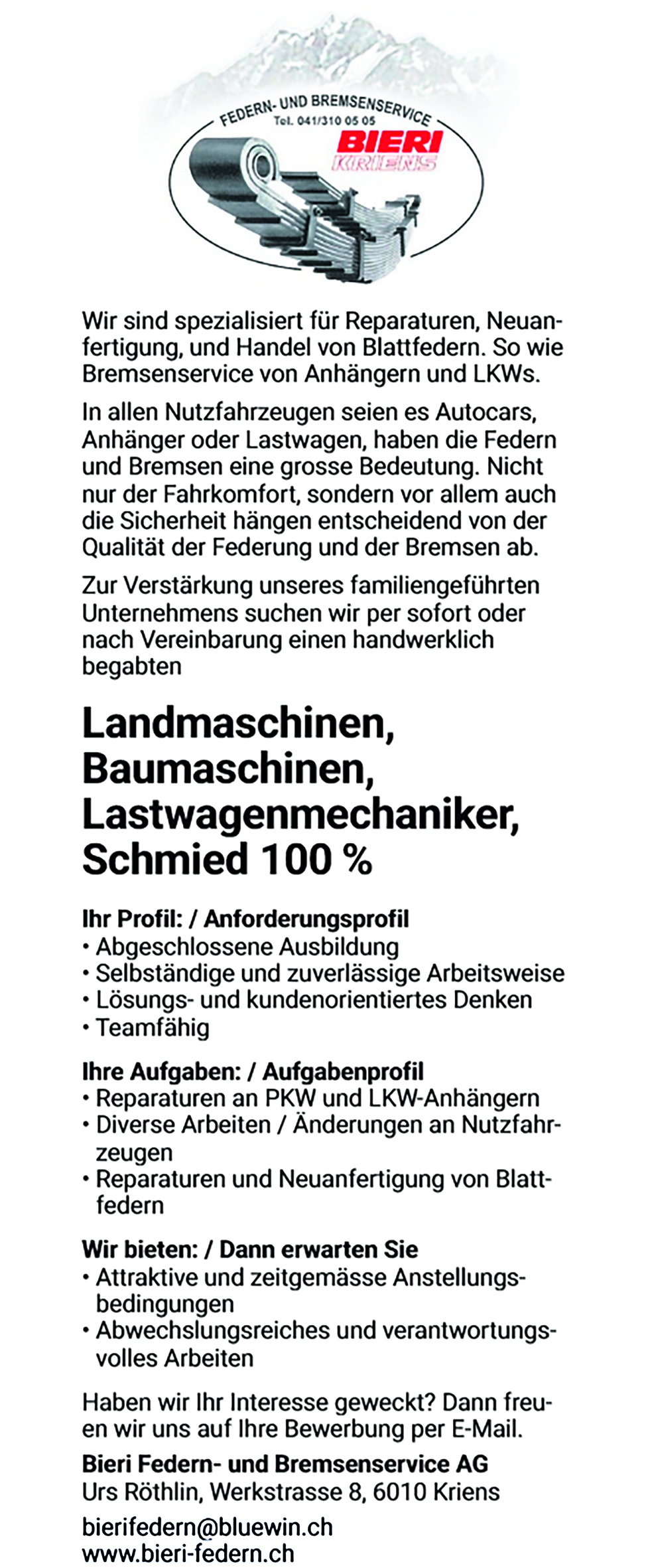 Vollzeit @Bieri Federn und Bremsenservice AG veröffentlicht 1 Tag agoJob-Beschreibung