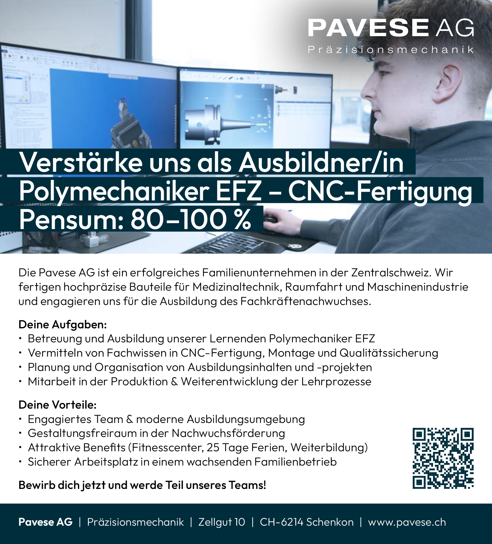 Ausbildner/in Poly­me­cha­ni­ker EFZ – CNC-Fer­ti­gung Pen­sum: 80–100 %