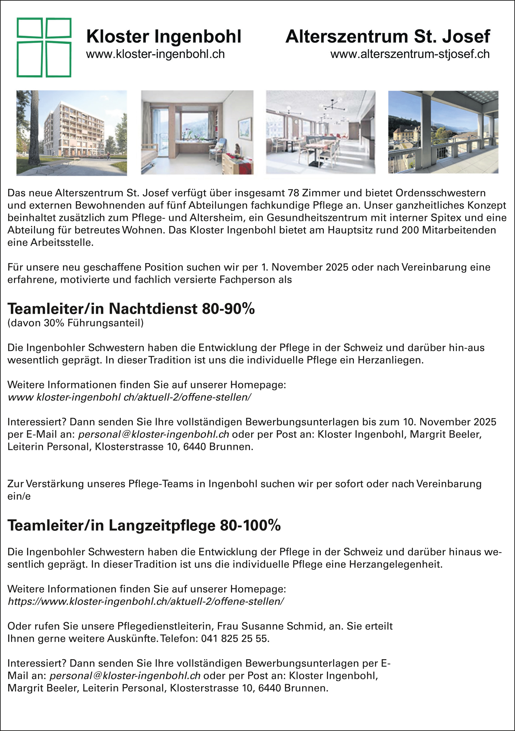 Teamleiter/in Nacht­dienst 80–90% und Teamleiter/in Lang­zeit­pfle­ge 80–100%