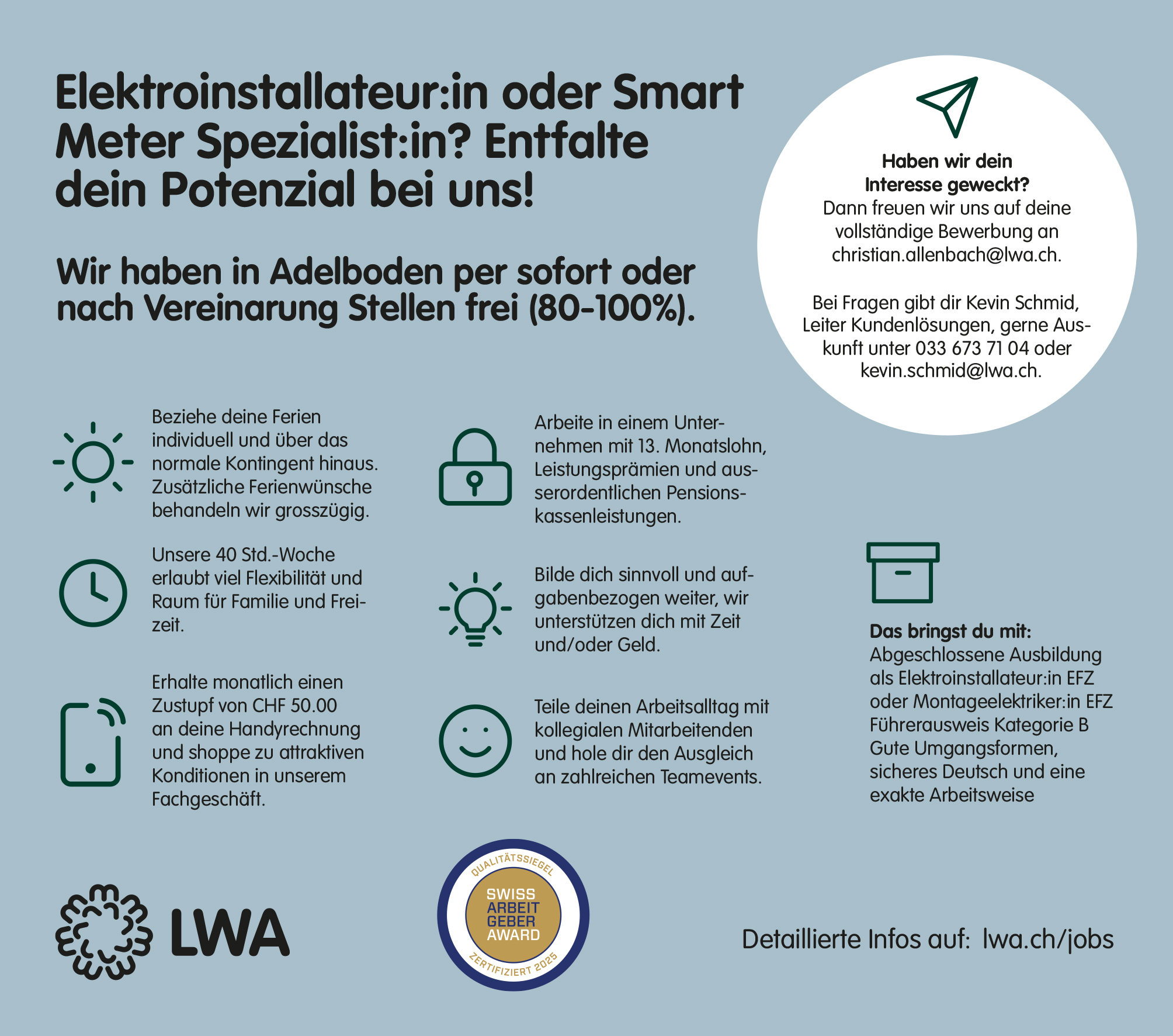 Teilzeit Vollzeit @Licht- und Wasserwerk Adelboden AG veröffentlicht 2 Wochen agoJob-Beschreibung