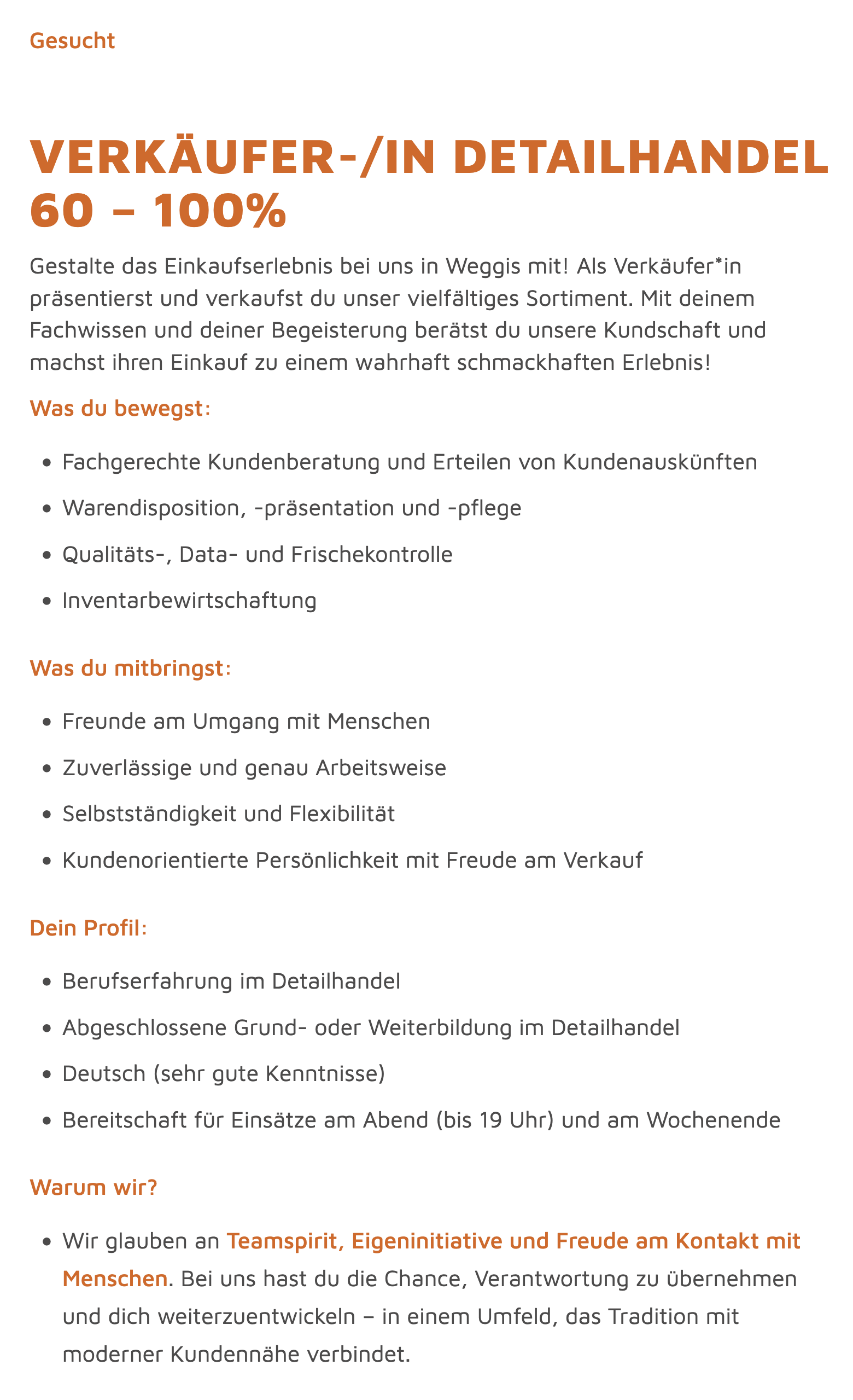 Ver­käu­fer/-in Detail­han­del 60–100%