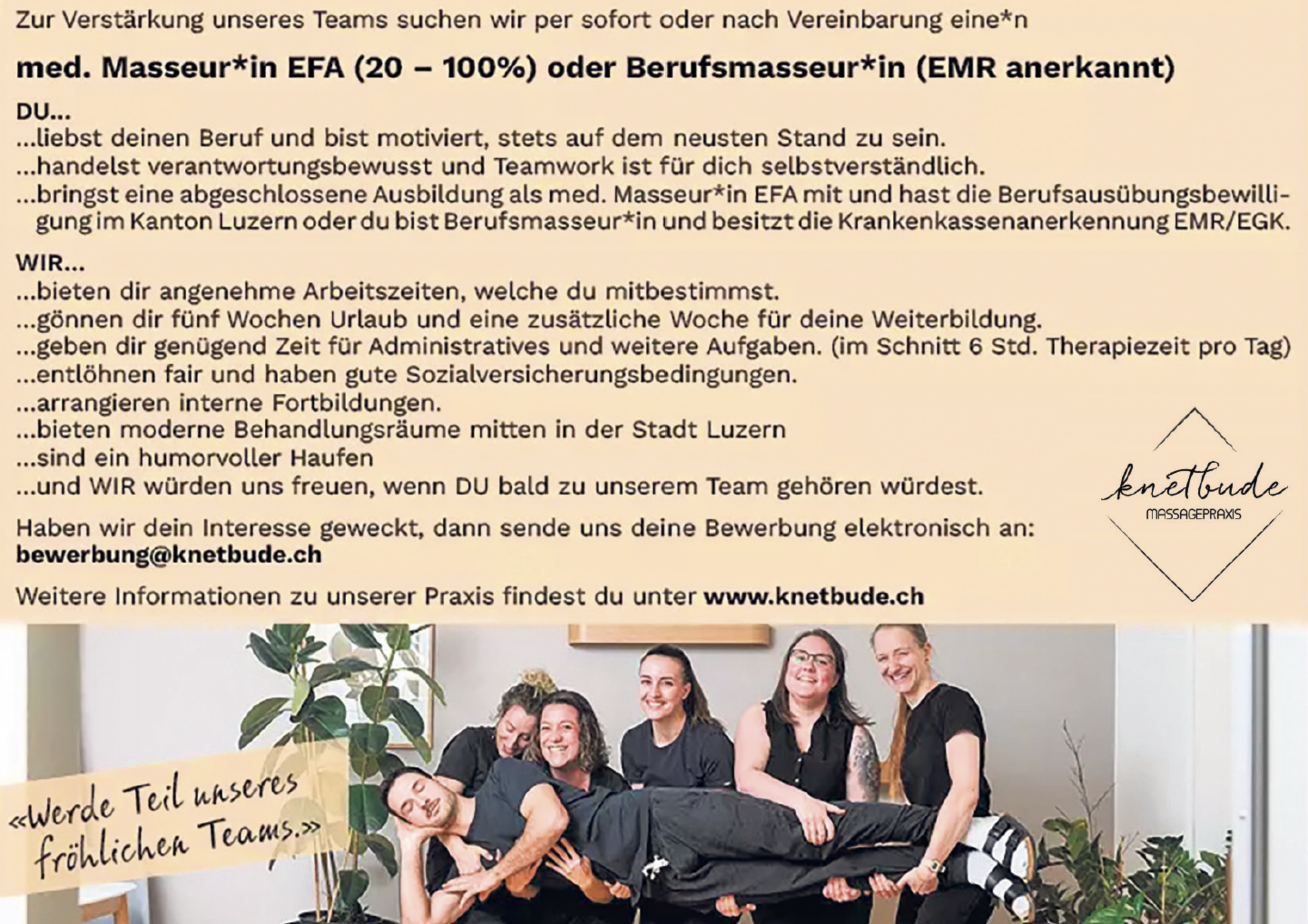 med. Masseur*in EFA (20 – 100%) oder Berufsmasseur*in (EMR aner­kannt)