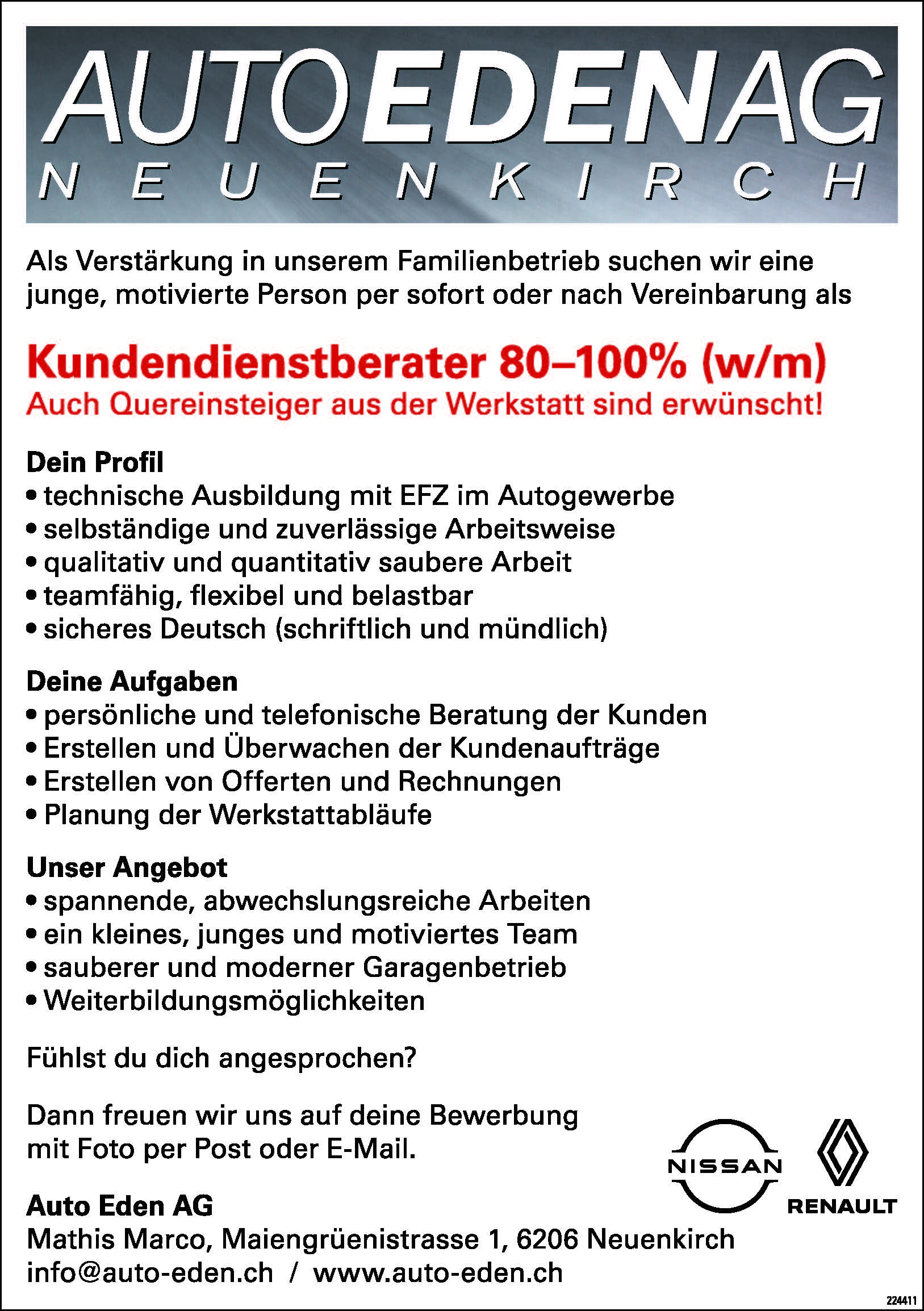 Teilzeit Vollzeit @Auto Eden AG veröffentlicht 1 Tag agoJob-Beschreibung