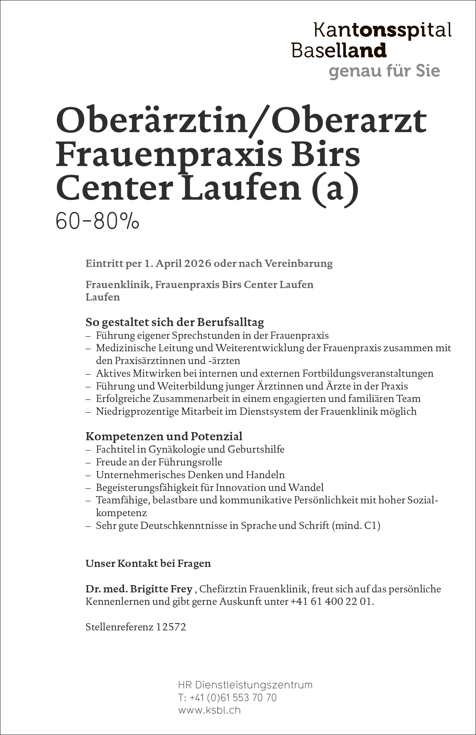 Oberärztin/Oberarzt Frau­en­pra­xis Birs Cen­ter Lau­fen (a) 60–80%