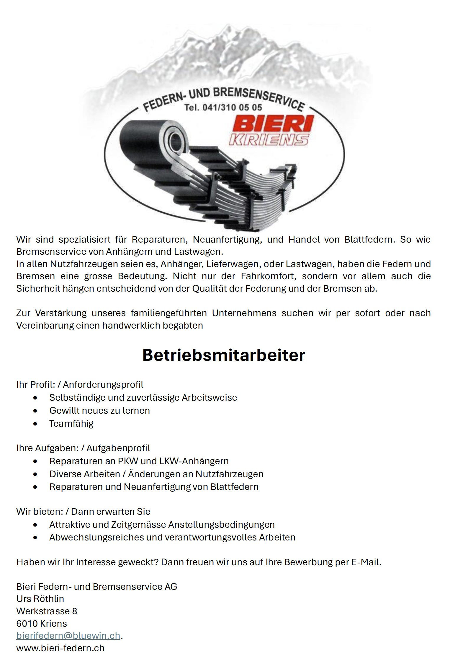 @Bieri Federn und Bremsenservice AG veröffentlicht 2 Tagen agoJob-Beschreibung