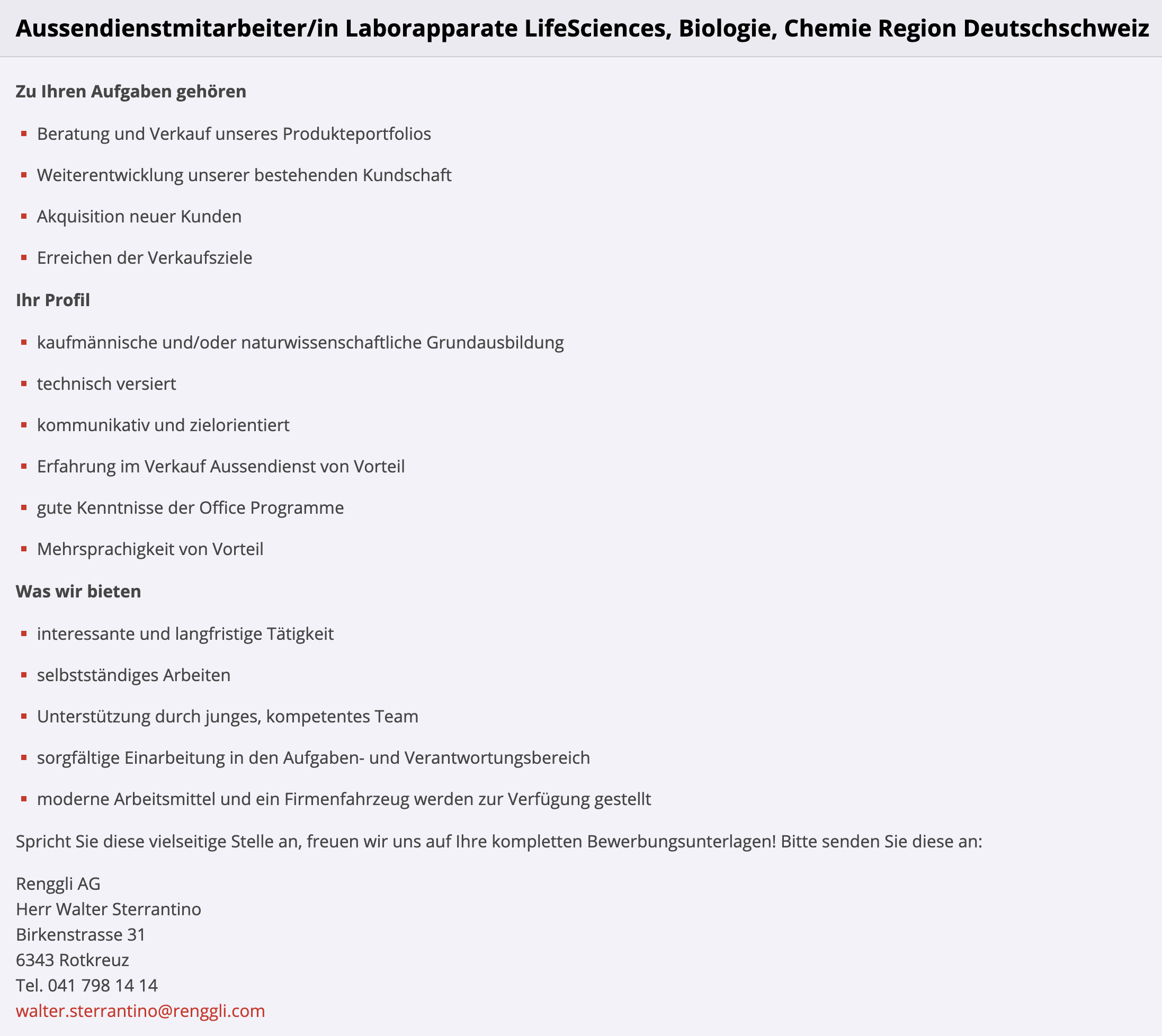 Aussendienstmitarbeiter/in Laborapparate LifeSciences, Biologie, Chemie Region Deutschschweiz