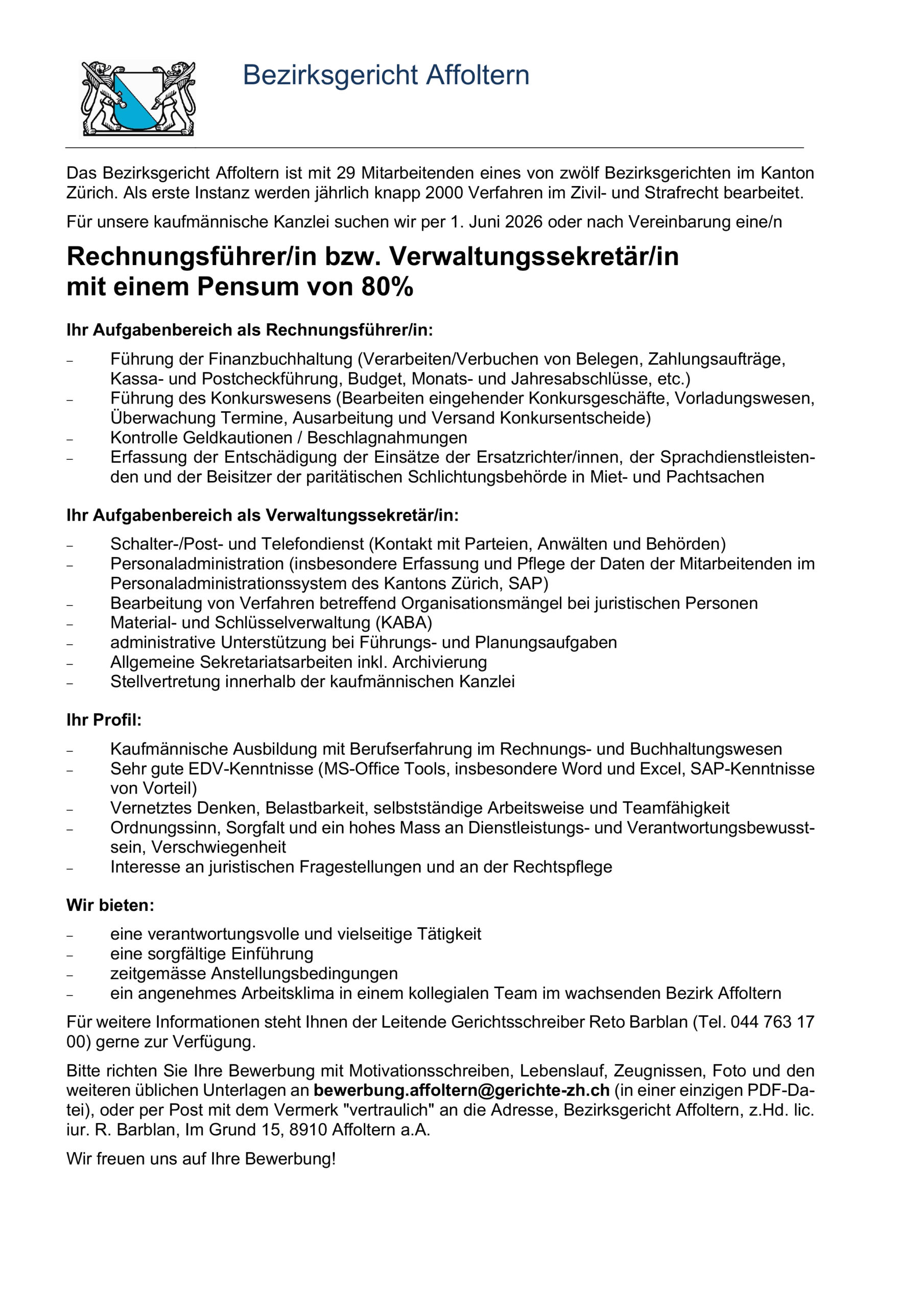 Teilzeit @Bezirksgericht Affoltern veröffentlicht 6 Tagen agoJob-Beschreibung