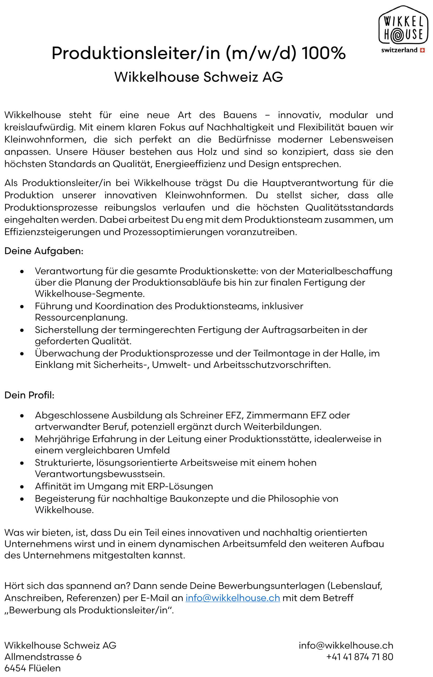 Vollzeit @Wikkelhouse Schweiz AG veröffentlicht 21 Stunden agoJob-Beschreibung