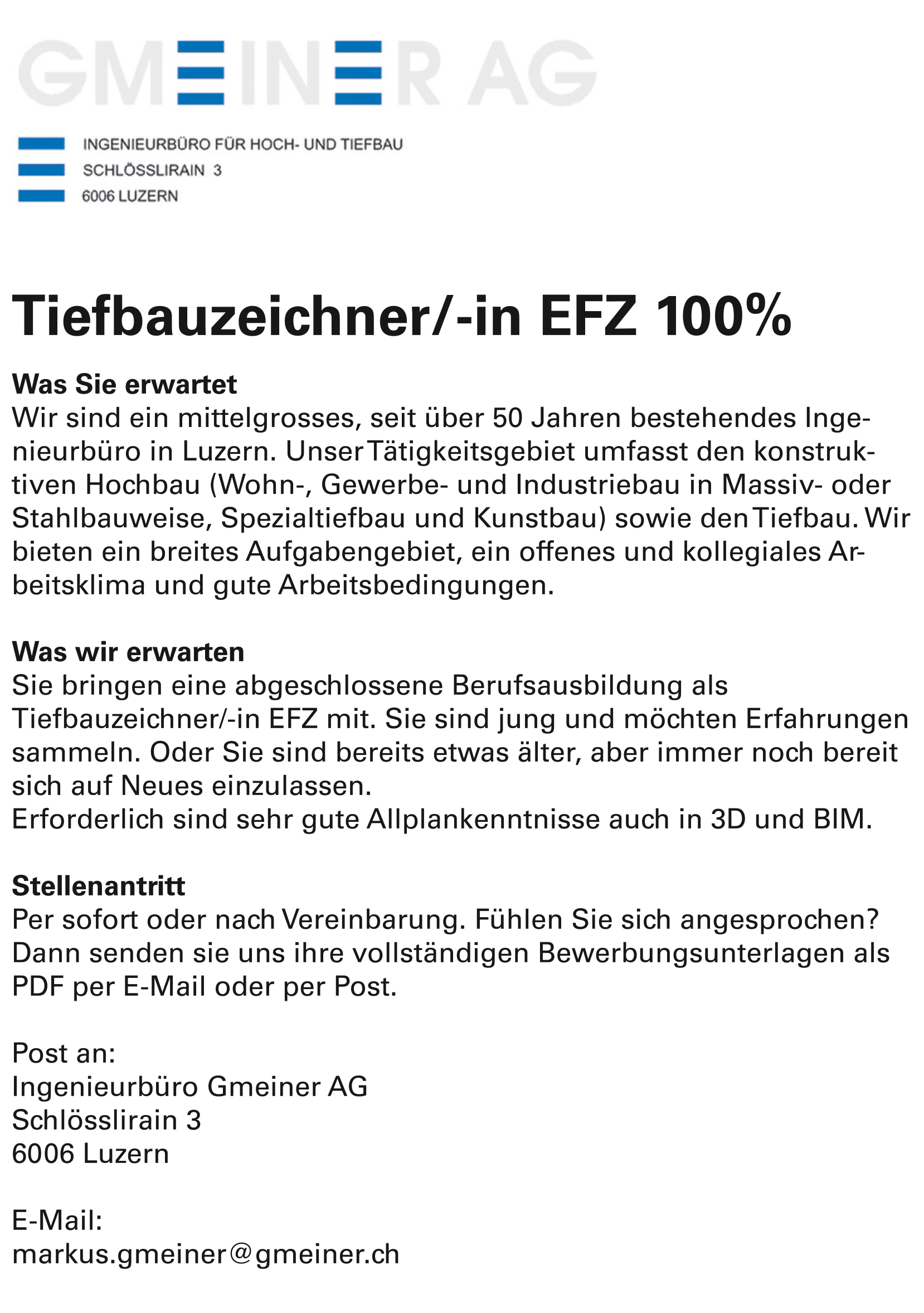 Vollzeit @Inge­nieur­bü­ro Gmei­ner AG veröffentlicht 21 Stunden ago