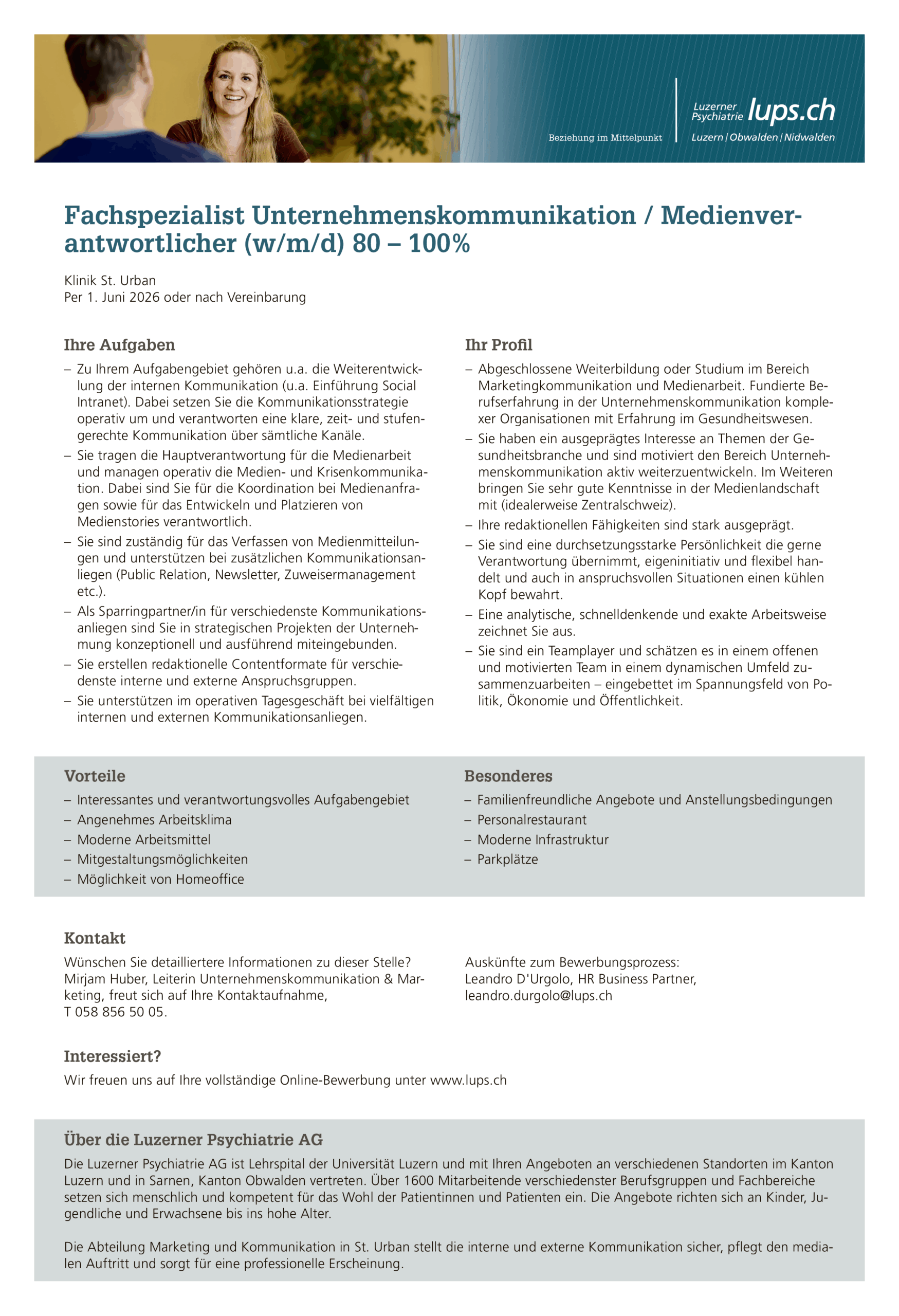 Fach­spe­zia­list Unter­neh­mens­kom­mu­ni­ka­ti­on / Medi­en­ver­ant­wort­li­cher (w/m/d) 80 – 100%