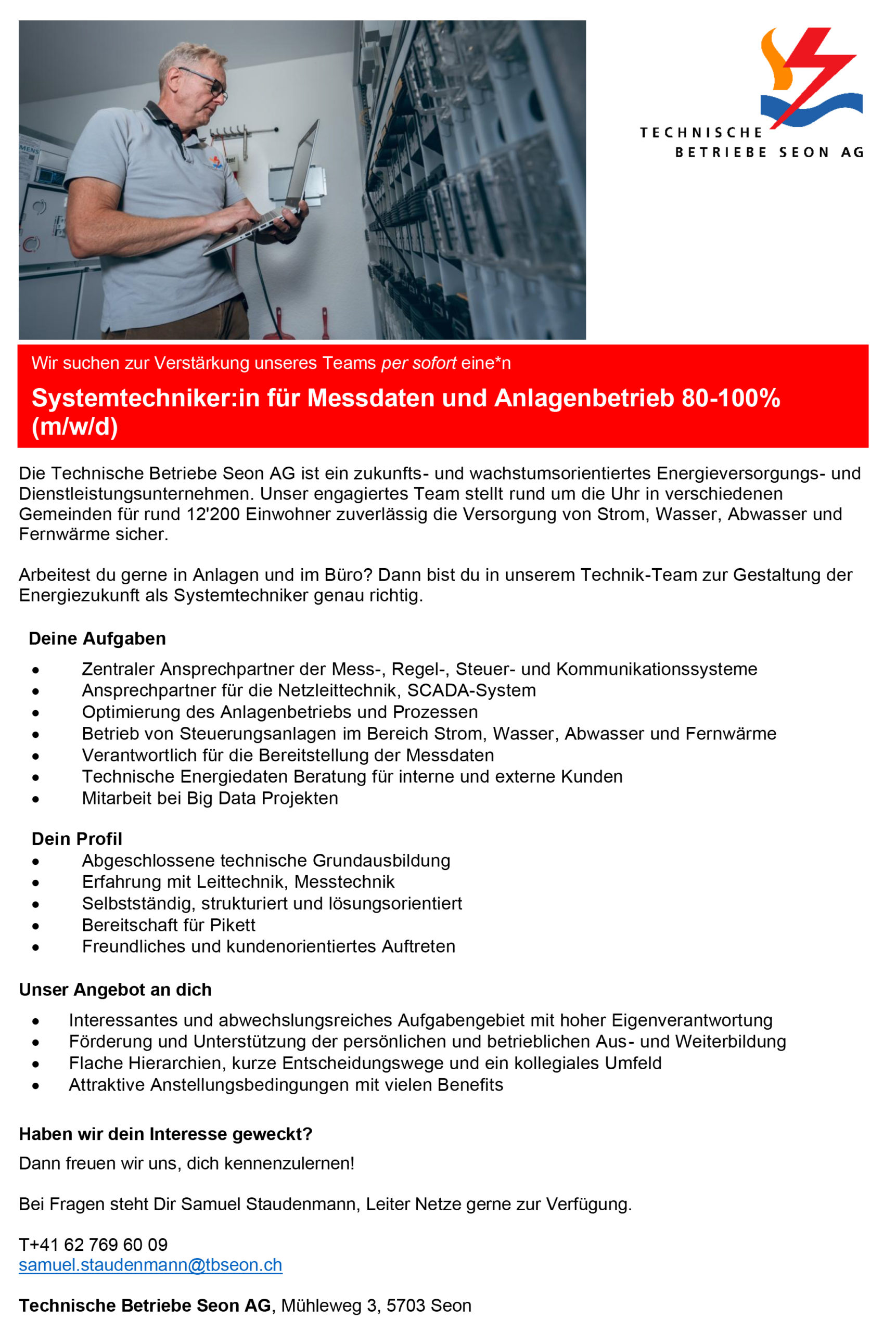 Teilzeit Vollzeit @Tech­ni­sche Betrie­be Seon AG veröffentlicht 13 Stunden ago
