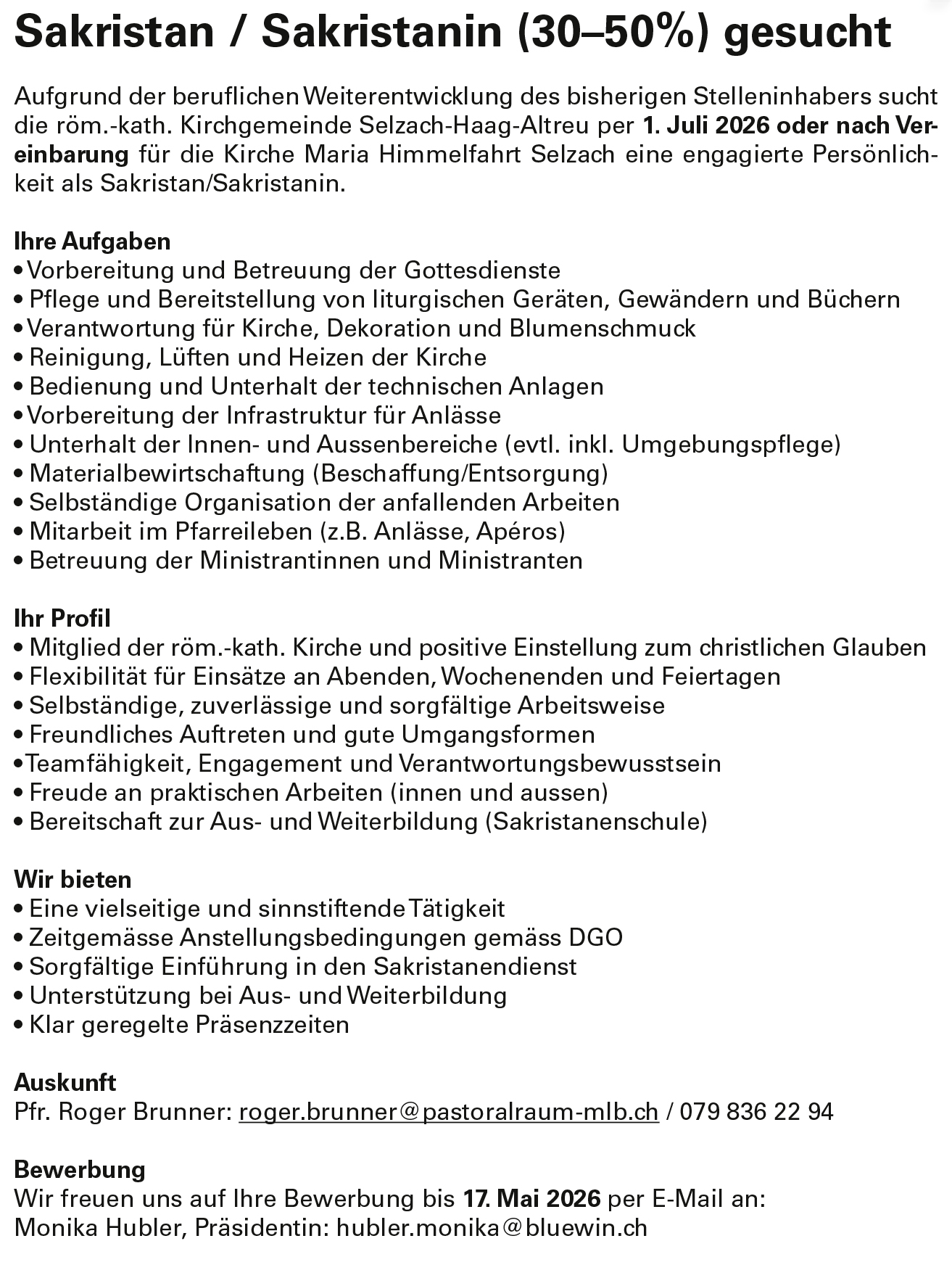 Teilzeit @röm. kath. Kirch­ge­mein­de Selz­ach Haag Altreu veröffentlicht 5 Tagen ago