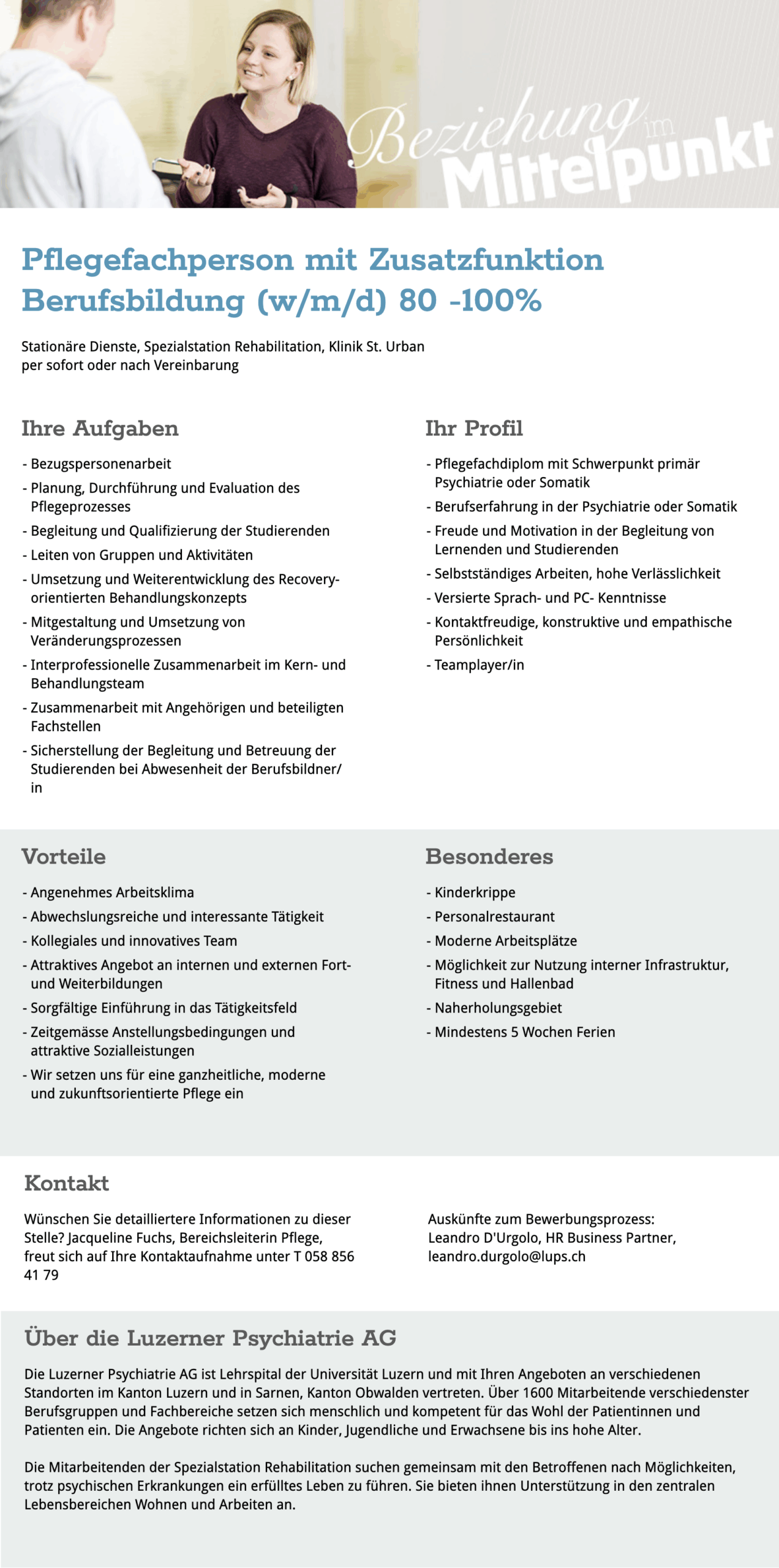 Teilzeit Vollzeit @Luzer­ner Psych­ia­trie AG veröffentlicht 7 Tagen ago